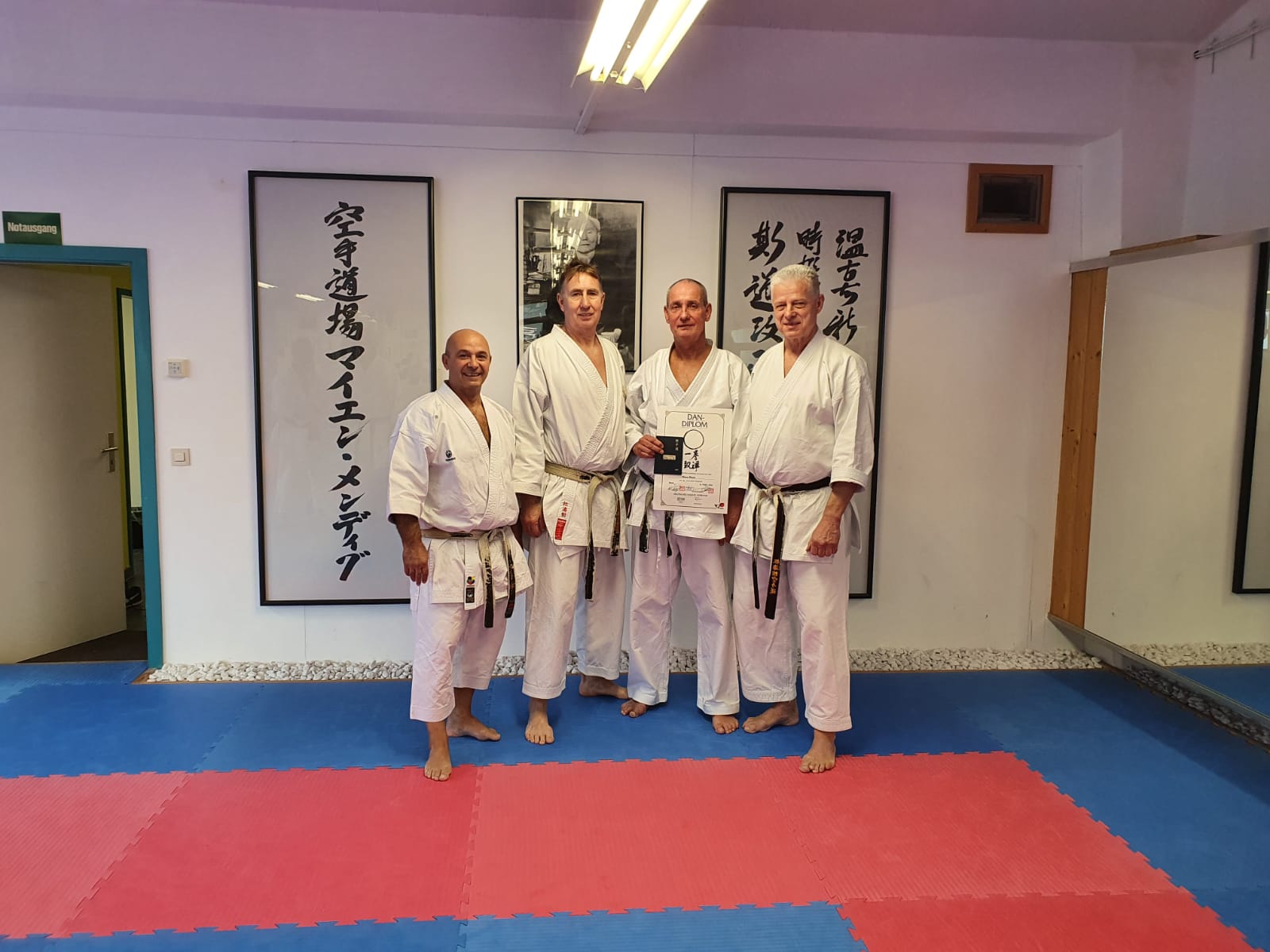 Die Prüfungen für hohe DAN- Träger sollten im Rahmen eines DAN- Shakai in Bonn stattfinden. Die Corona- Krise jedoch führte dazu, dass der Lehrgang für DAN- Träger abgesagt werden musste. Die Prüfungen fanden im kleinen Rahmen trotzdem statt. Sie wurden jedoch von Bonn nach Mendig verlegt. Dort trat Klaus unter den kritischen Augen von Gunar Weichert, Georg Karras und dem Präsident des Karateverbandes Nordrhein- Westfalen Rainer Katteluhn an, um die hohe Prüfung abzulegen. Im Vorfeld hatte Klaus schwere, stressige Wochen, vor Allem Wochenenden vor sich. Unzählige Trainingseinheiten besonders in Mendig standen auf dem Programm. Dies geschah unbemerkt von den Mitgliedern unseres Vereins. Daher war die tolle Überraschung umso größer.